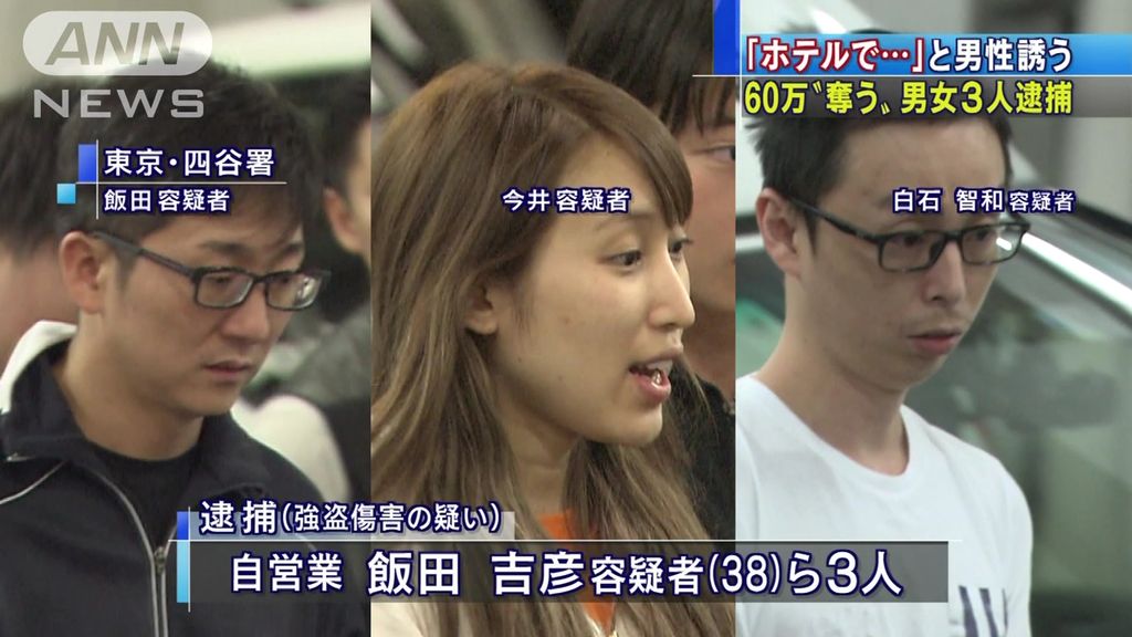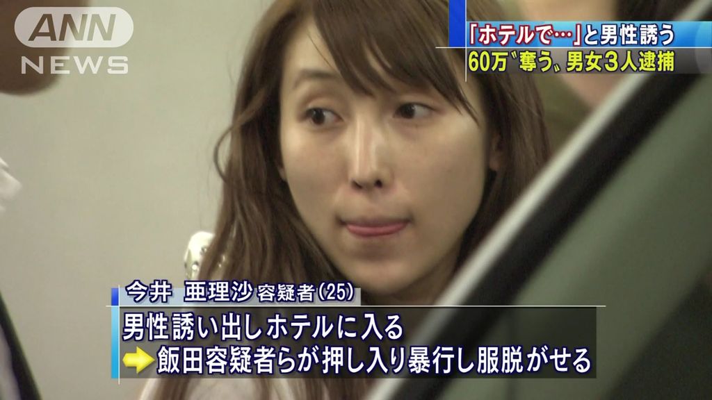 ホテルに誘い出し暴行 “60万円奪い”男女3人逮捕東京・新宿区で25歳の女がホテルに男性を誘い、その後、現れた仲間の男2人とともに全身を殴るなどの暴行を加えて、約60万円を奪ったとして逮捕されました。