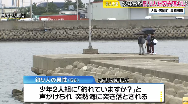 19日午前7時5分ごろ、大阪府忠岡町新浜の大津川の河口付近にある突堤で、釣りをしていた同府八尾市の男性会社員(56)に10代とみられる少年数人が「釣れていますか」などと声を掛け、いきなり男性の背中を押して海に転落させた。
