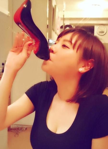 写真で公開されたグラスは、高級靴ブランド『クリスチャン・ルブタン』のシンボルといえる、靴の裏が赤い、黒のハイヒールを模したものである。