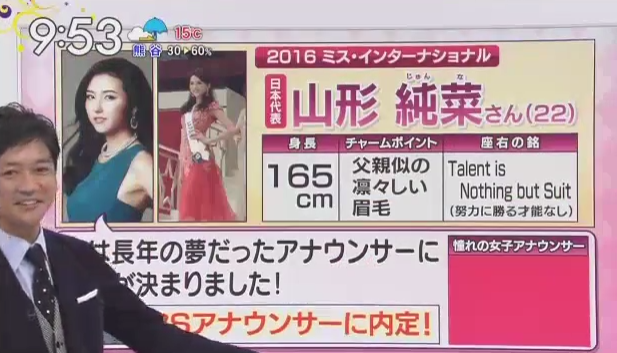 27日、都内で行われた「2016ミス・インターナショナル世界大会」で山形さんはファイナリスト15人に選ばれており、「アナウンサーになりたい」と公言していた。