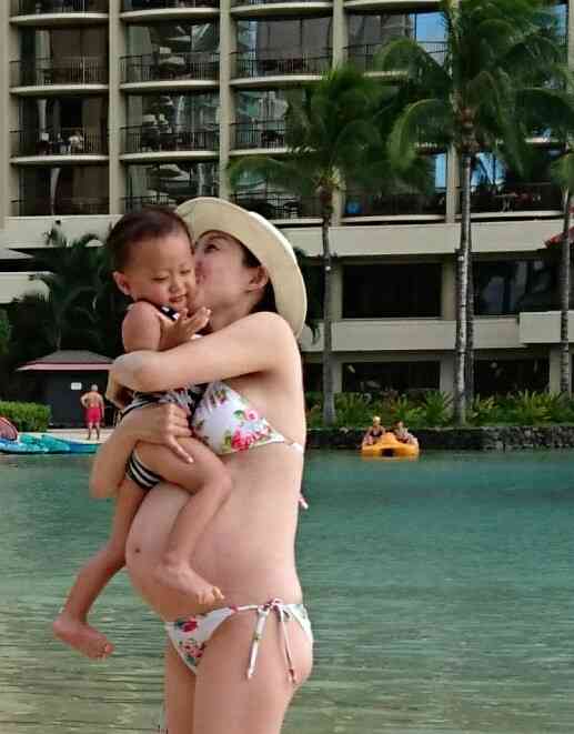 お笑いコンビ・クワバタオハラの小原正子(41)が、妊娠中のビキニ姿を自身のブログで披露している。 家族でハワイを訪れていた小原。これまでのブログではハワイ旅行を振り返りながら、鉄板焼きを食べた時のことやゴルフをしている様子を紹介していた。今回のブログでは、妊娠9ヶ月でのビキニ姿を披露。 さらには、息子・誠希千(せいきち)くんが小原の大きくなったおなかに乗って抱っこされている写真や、海に一緒に入って手をつないでいる写真などを公開している。