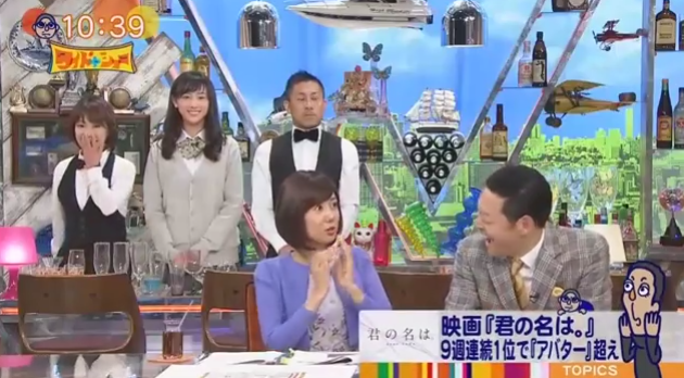 超ヒット作となったアニメ映画「君の名は。」がテーマとなった中で、山崎アナが同作の魅力を熱く語る姿を見て、松本が「やっぱ(興行収入)100億を超えようと思ったら、ブスなOLを巻き込まないといけないな」と感想を発すると、自身のことを「ブスなOL」と名指しされたと感じた同アナが怒りの表情を見せた。