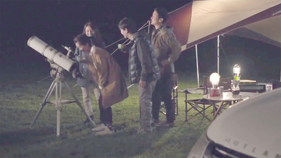 問題の場面は、開始から16秒あたり。夜のキャンプ場で、女性がのぞく反射式望遠鏡の鏡筒の向きが逆さまになっていました。この向きでは星は見えず、地面しか見えません。