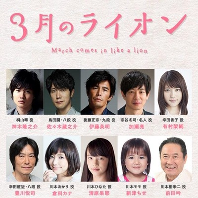 羽海野チカの同名マンガが原作の「3月のライオン」は、17歳のプロ棋士・桐山零を主人公にした人間ドラマ。「ミュージアム」の大友啓史がメガホンを取り、出演には有村架純、清原果耶、倉科カナ、佐々木蔵之介、加瀬亮、伊藤英明、豊川悦司、前田吟、高橋一生らが名を連ねている。