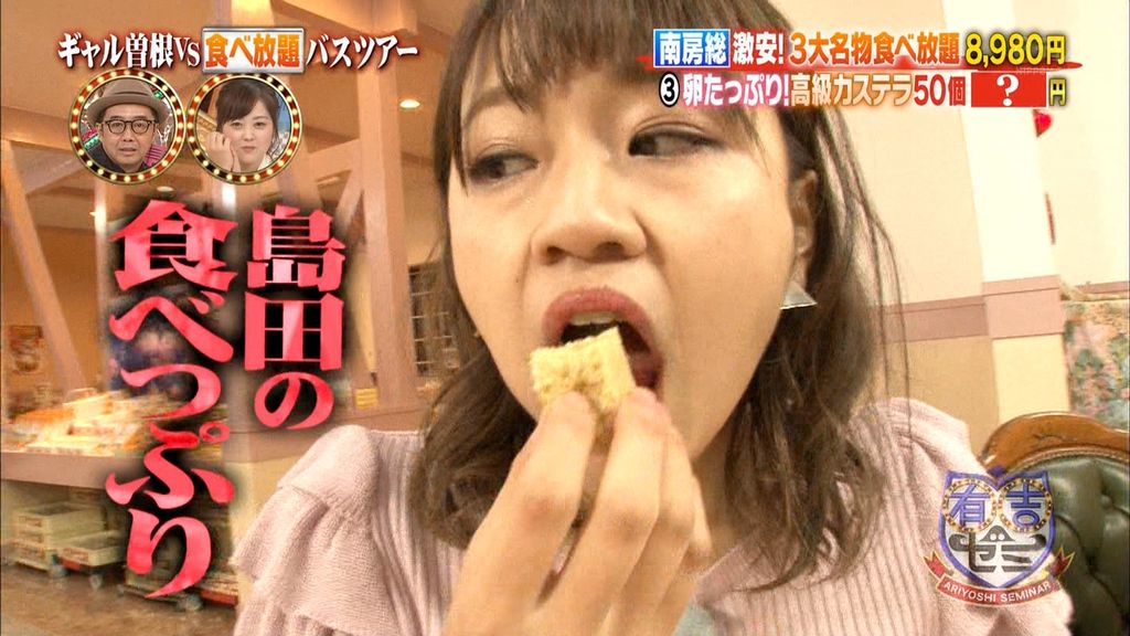 「ギャル曽根 vs 食べ放題バスツアー」のコーナーに出演した島田。