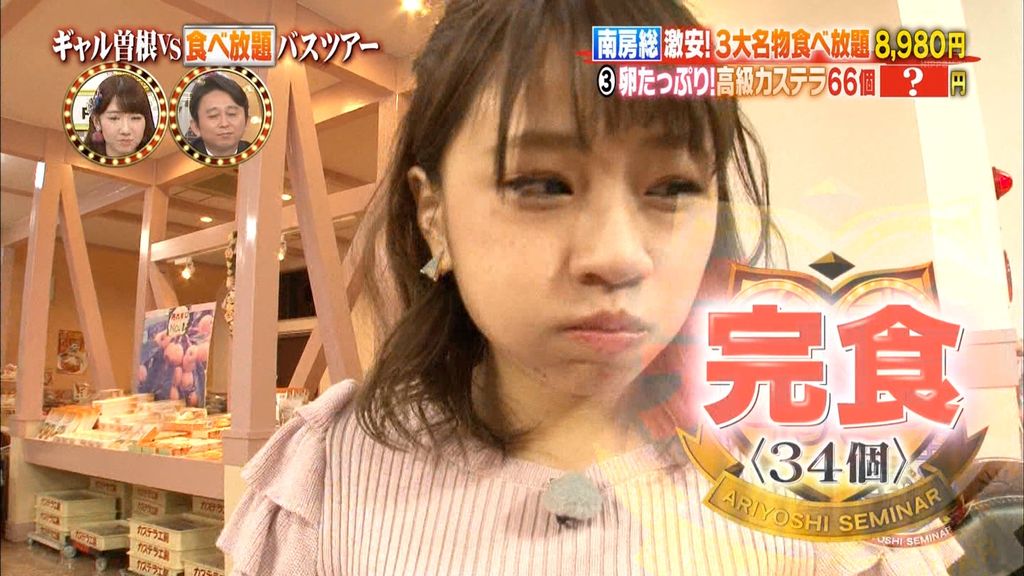 次第に失速し、最終的にはギャル曽根の66個には及ばなかったが、34個を食べきり、大食いアイドルの意地を見せた。