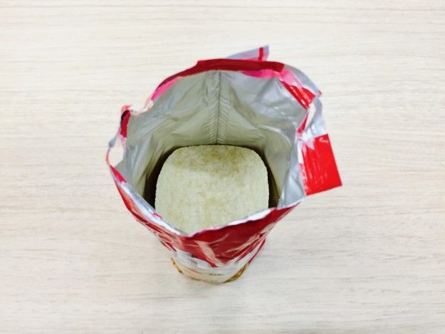 空気部分は、SNSで言われている通り、クリスプの方が目立ちました。内容量は、どちらも115グラム。チップスターの方が、表面が粗いので、重なったときに、高さが出るのだと思われます。
