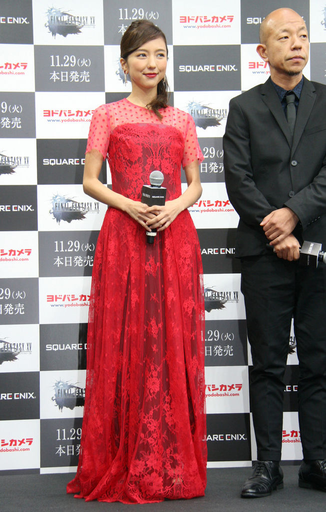 女優の真野恵里菜さんが29日、東京都内で行われた人気ゲームの最新作「ファイナルファンタジー(FF)15」(スクウェア・エニックス)の発売記念イベントに出席。肩が透けたレース素材の真っ赤なドレス姿で登場し、会場に花を添えた。