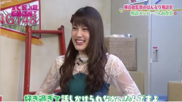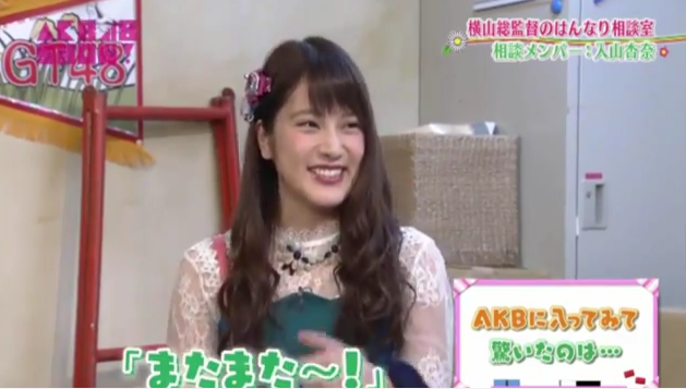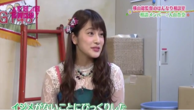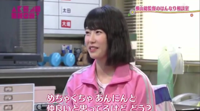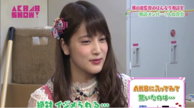 AKB48に入ってから驚いたことは「イジメがないことにビックリした」と話し、入る時イジメられると思っていたと言い「テレビでよく、AKB48の人が「仲悪いんでしょ!」とか言われて「仲良いですよ~!」みたいなのを見て、またまたーって思ってた」という。横山も「仲いいよなAKB48って」と同調する。