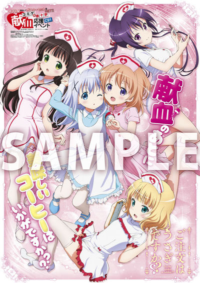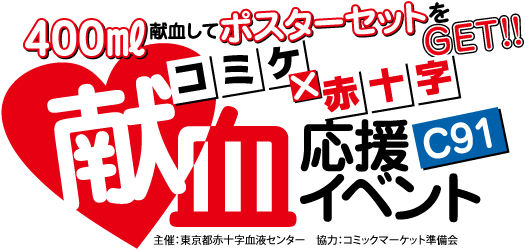 コミックマーケット開催期間中は、会場付近の献血会場と全国の赤十字血液センターで。コミックマーケット91終了後は全国の赤十字血液センターで400mlの献血をすることにより、ポスター&タペストリーセットをもらえます。