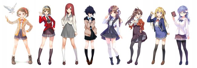 ・堀口悠紀子氏が新たに描きおろした「22/7」メンバーが声優を務めるアニメキャラクター8人。前列左から斎藤ニコル、立川絢香、2列目左から戸田ジュン、藤間桜、滝川みう、後列左から河野都、佐藤麗華、丸山あかね
