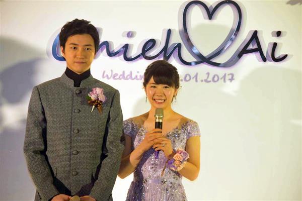 福原選手は薄紫色のドレス、江選手は灰色の中山服姿で登場。江選手は「1月1日は新たな始まり。小愛(福原選手の愛称)との未来の生活も、幸せで楽しい始まりであるように」とあいさつした。福原選手は、披露宴は「試合より緊張する」と笑顔を見せた。