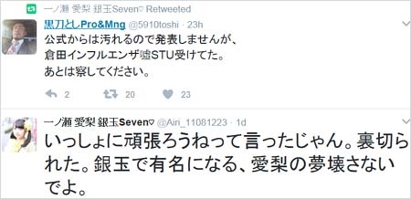 倉田は26日、“インフルエンザ”のためこの日のライブイベントを欠席し、メンバーの結城琉梨は「愛梨ちゃんとふたりで頑張るー!!倉田のぶんまで盛り上げなきゃ」などと意気込み、一ノ瀬愛梨も「倉田いんふる早く治してね~!」と気遣いを見せていた。