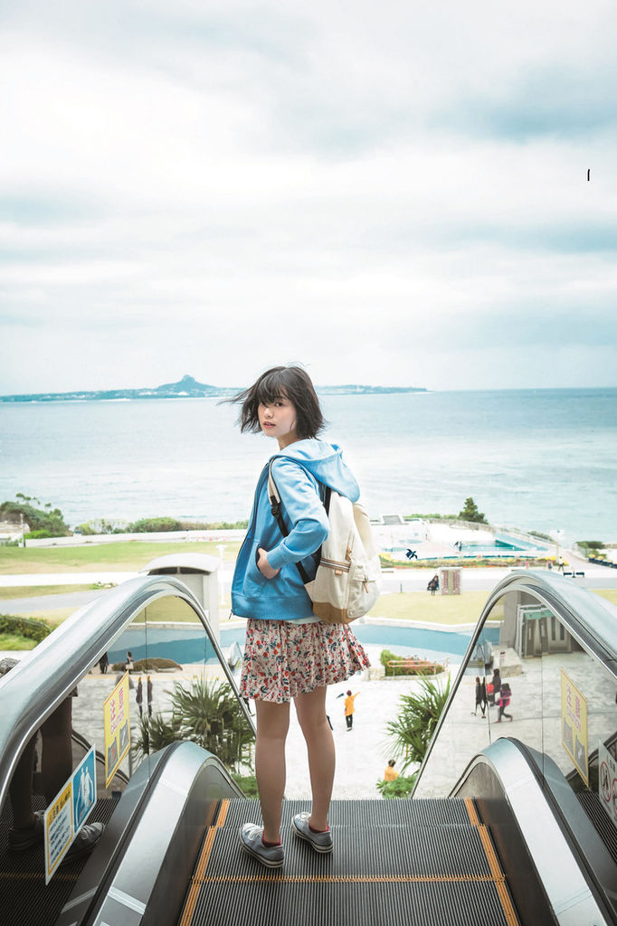 グラビアのテーマは沖縄修学旅行で、制服姿のほか、Tシャツを着て海ではしゃいだり、枕投げを楽しむ姿などを披露した。