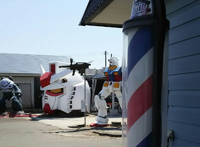 理容室脇にそびえ立つ、ガンダムの勇姿――。こんな光景が見られるのは青森県上北郡おいらせ町にあるスズキ理容の店舗脇。