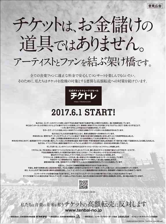 業界をあげての転売対策を評価する声がある一方で、「手数料が高すぎる」「転売業者の仕入れ先に使われるのでは」など批判も寄せられた。事務局は「厳しい意見は真摯に受け止めている」とした上で、「今後も不正な取引で多額の利益を出しているネットダフ屋を撲滅し、本当にライブに行きたい音楽ファンを救済する」「ネット上の投機的高額転売を取り締まる法令制定に向け、現在、政府や関係機関にも働きかけを行っている」とアピールしている。