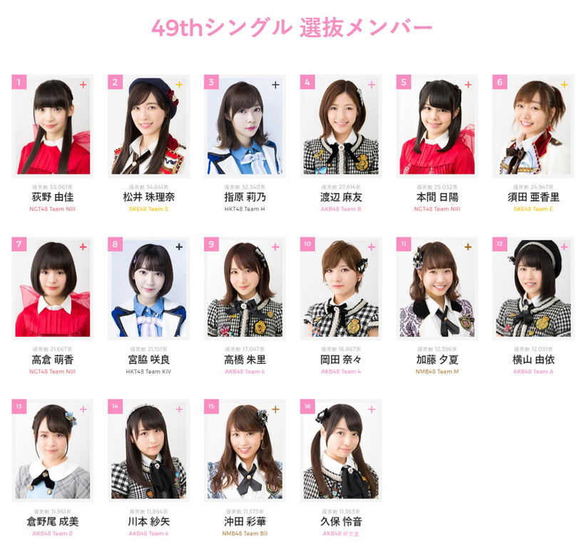 NGT48は選抜メンバーの5位に本間日陽(ほんまひなた・17)、7位に高倉萌香(16)、アンダーガールズの24位に山口真帆(21)、ネクストガールズの34位に西潟茉莉奈(21)がランクイン。以下、83位に中井りか(19)、89位に大野絢香(19)、92位に北原里英(25)も入るなど、今年4月のデビューの勢いをそのままに、大躍進を遂げた。