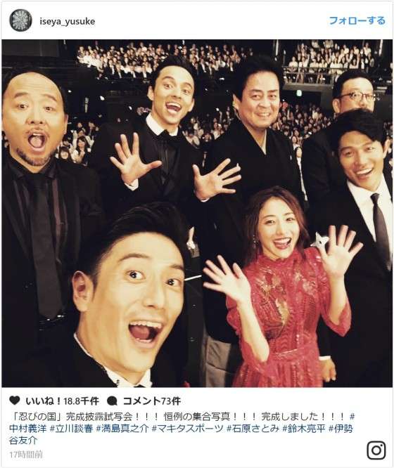 石原さとみが可愛すぎる!伊勢谷友介の自撮り写真が話題に - シネマトゥデイ伊勢谷友介が5月31日、自身のInstagramで公開した、石原さとみら映画『忍びの国』関係者と共に写るセルフィーが話題を呼んでいる。 この写真は、同日行われた『忍びの国』ジャパンプレミアの場で撮影されたものと思われ、伊勢谷&石原のほか、同作に出演している鈴木亮平、マキタスポーツ、満島真之介、立川談春、メガホンを取った中村義洋監督が顔をそろえている。 ファンからは「伊勢谷友介さん相変わらずカッコイイ」「さとみちゃんが可愛すぎるー」「豪華なメンバー」といったコメントが寄せられたほか、「劇場に観に行きます」「公開が待ち遠しいです」という声も上がっており、7月1日の映画公開を控え、盛り上が