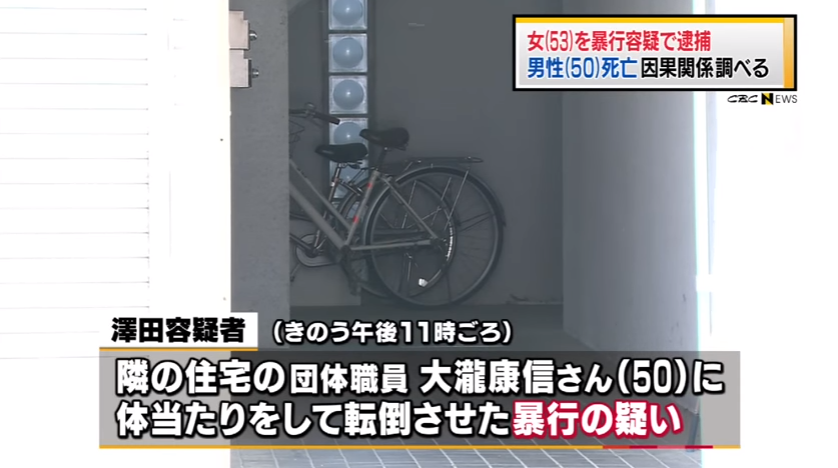 沢田容疑者は「体当たりしていない」と否認しているという。男性は転倒した約10時間後、病院で心室細動により死亡した。同署で転倒と死亡の因果関係を調べている。同署によると事件直前、沢田容疑者が男性に騒音を注意され、口論になっていた。2人は騒音を巡りたびたびもめていたという。