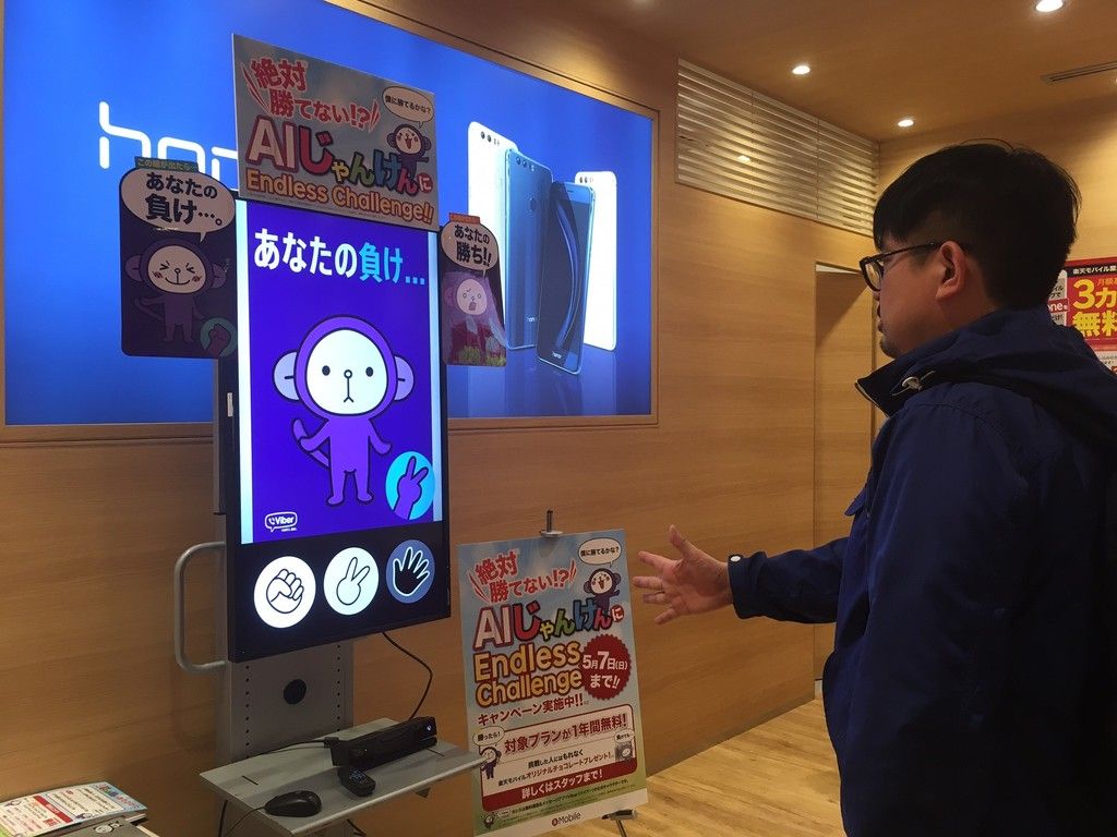 秋田市御所野のイオンモール秋田1階の「楽天モバイルイオンモール秋田店」で、人工知能(AI)を使った「絶対勝てないじゃんけんマシン」に挑戦できる。6月11日まで。
