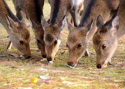 「奈良のシカ」は、春日大社の神の使い「神鹿(しんろく)」とされる。県によると、文化財保護法に基づく保護の対象となっている2005年合併以前の旧市内に、約4000頭が生息する。