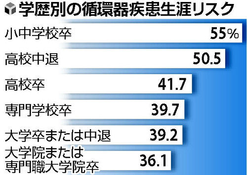 学歴別にみると、最終学歴が高いほど循環器疾患の発症リスクは下がり、大学院卒が最も低かった。高校中退者の発症リスクは50・5%と2人に1人。高卒の41・7%に比べ約10ポイントも高く、高校教育を終えたかが健康格差の分かれ目となることがうかがわれた。