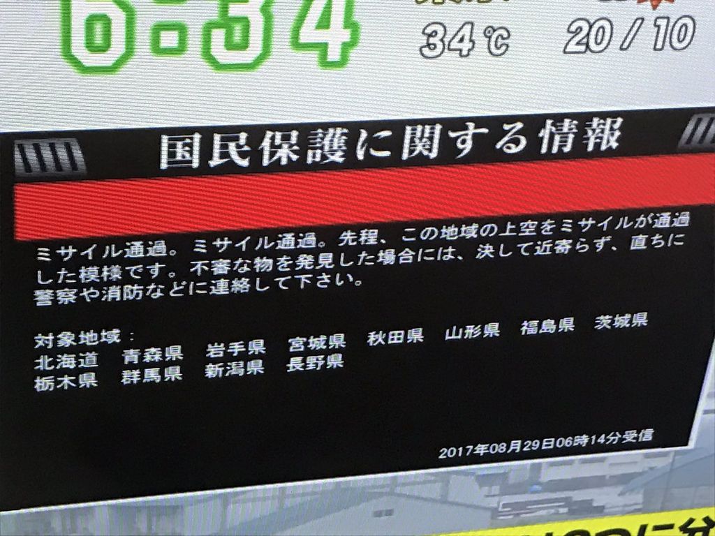 北朝鮮から発射されたミサイルは北海道上空を通過し北海道東沖に落下とのこと。