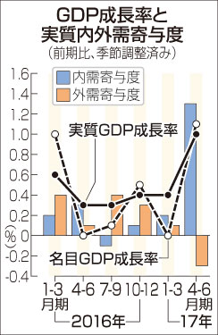内閣府が14日発表した2017年4~6月期の国内総生産(GDP)速報値は、物価変動の影響を除く実質で前期比1.0%増、年率換算では4.0%増だった。