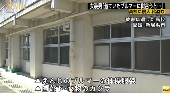 31日未明、愛媛・新居浜市の県立高校で警報が鳴り、駆けつけた警察官が、1階の教室で目にしたのは、えんじのブルマーの体操服姿で、白の靴下、女物のカツラをかぶり、盗んだ女子生徒の体育館シューズをはいた男だった。