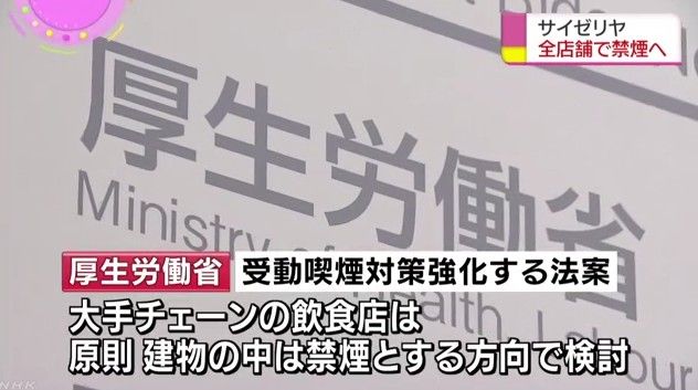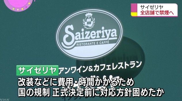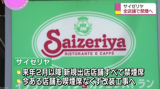 2020年の東京オリンピック・パラリンピックを控えて、大手チェーンの飲食店を原則、禁煙とする法案の検討が進められている中、ファミリーレストラン大手のサイゼリヤは、再来年9月までに全国のすべての店舗を原則として禁煙とする方針を固めました。