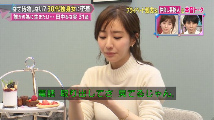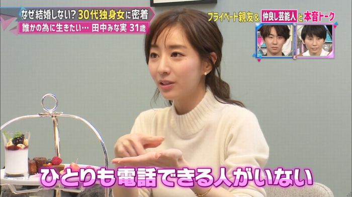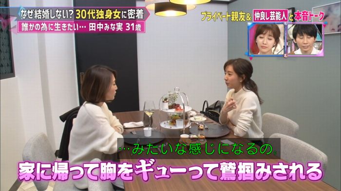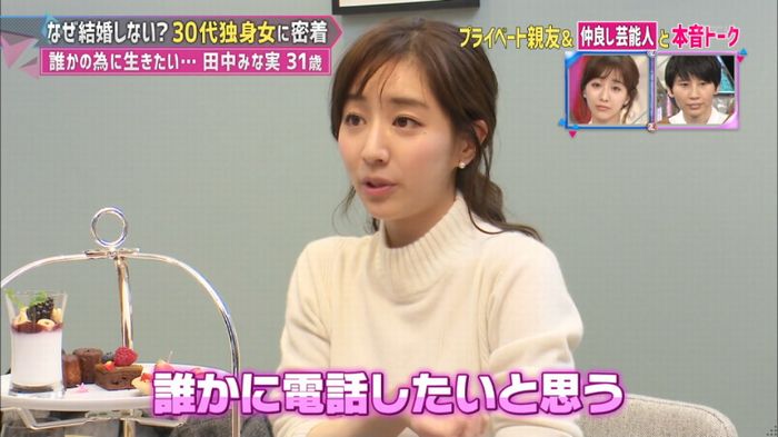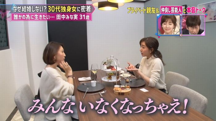 番組でみな実アナは中学、高校、大学と続く親友と出演。みな実アナは「最近、お酒を飲む仕事が多くて」と胸の内を語った。みな実アナは同局系「ダウンタウンなう」の「本音ではしご酒」に時折出演している。