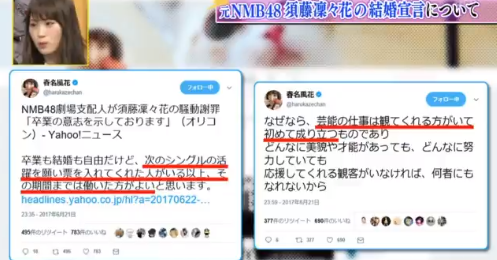 須藤の結婚宣言に対しては「次のシングルの活躍を願い、票を入れてくれた以上、その期間は働いたほうがいい」「芸能の仕事は観てくれる方がいて初めて成り立つ」と発信し、多くの共感を呼んだ。