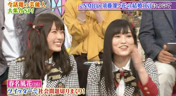 アイドルグループ「NMB48」の山本彩(24)、渋谷凪咲(21)が30日、日本テレビ系「ダウンタウンDXDX ~ワイドショーを賑わした芸能人大集合スペシャル~」(午後9時から)に出演し、今年6月、「第9回AKB48選抜総選挙」の開票イベントで世間を驚かせた元メンバー・須藤凜々花(21)の結婚宣言に言及。