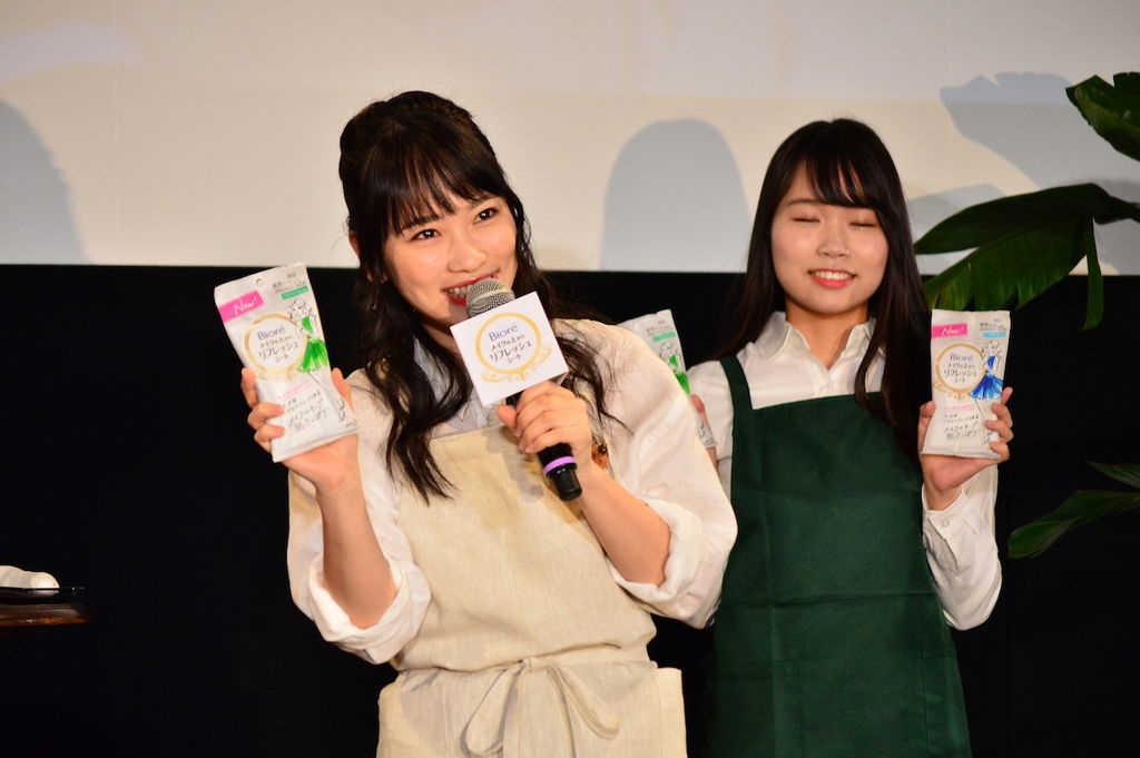 発表会にはCMと同じ居酒屋店員の衣装で現れ、「この商品は男性で言うところのおしぼりです。男性って居酒屋でおしぼりで顔拭くじゃないですか。これはメイクが落ちないので女性でも」と新商品をアピールした。