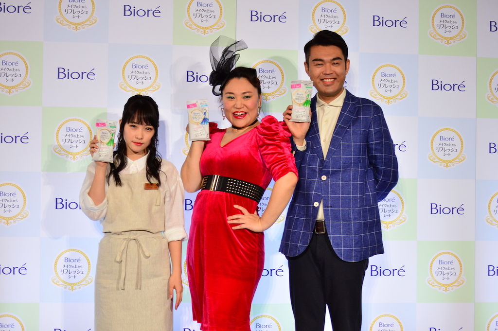 花王は3月26日、「ビオレ(BIORE)」の新商品「メイクの上からリフレッシュシート」の新テレビCM発表会を都内で行なった。