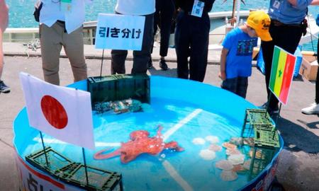 19日に水揚げされたミズダコに小平を逆さまにした名を付け、直径約2メートルのビニールプールに「日本」「対戦相手」「引き分け」のかごを入れてどこに近づくかで占った。