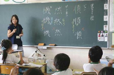 千葉県松戸市立殿平賀小学校4年の国語の時間。担任の坂寄宏子教諭が漢字の書き順を1画ずつ色分けして板書した。