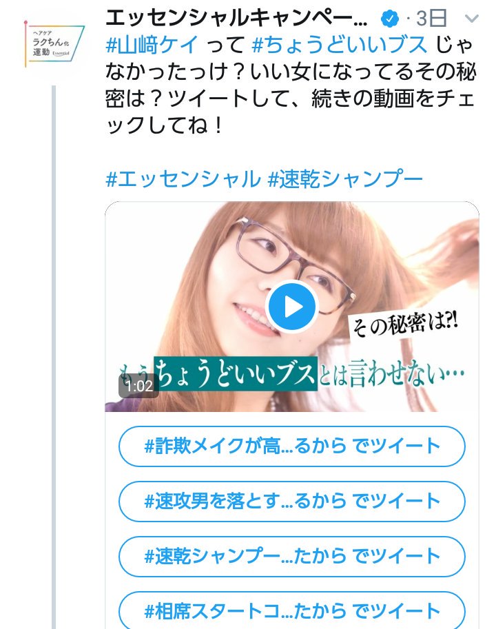 動画は、リニューアル商品を使うことでロングヘアを乾かす煩わしさが解決されることを訴求する内容で、相席スタートの2人による掛け合いも収められていた。しかし、ネット上で最も批判を浴びたのは動画の内容ではなく、動画へ誘導するために呟かれたツイートだ。エッセンシャル公式ツイッターは7月22日、
