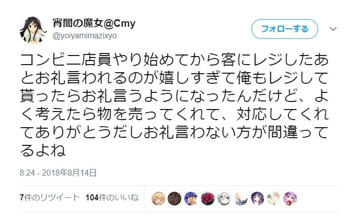 宵闇の魔女@Cmy@yoiyamimazixyo コンビニ店員やり始めてから客にレジしたあとお礼言われるのが嬉しすぎて俺もレジして貰ったらお礼言うようになったんだけど、よく考えたら物を売ってくれて、対応してくれてありがとうだしお礼言わない方が間違ってるよね 2018/08/14 08:24:22