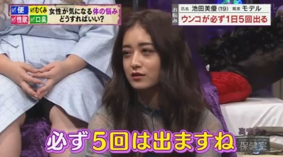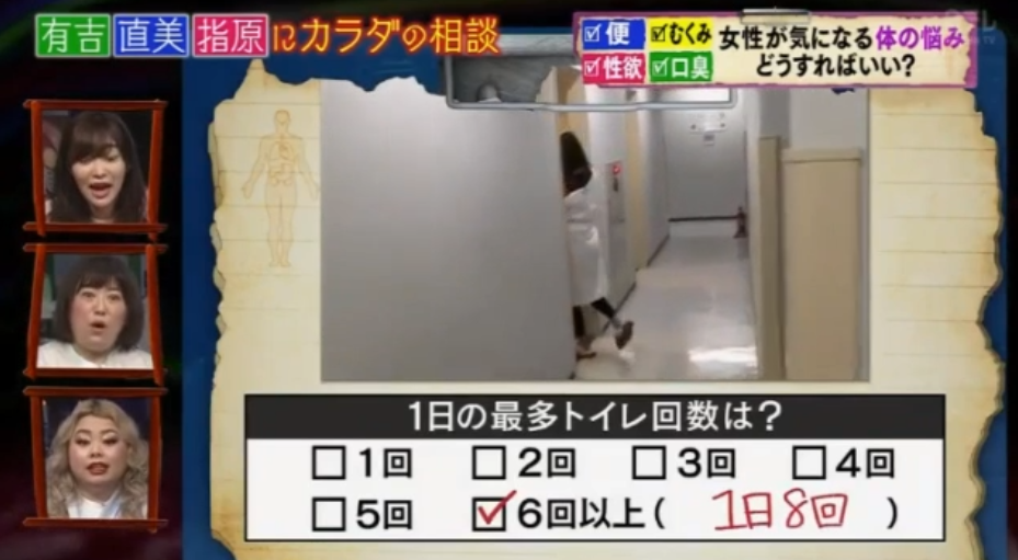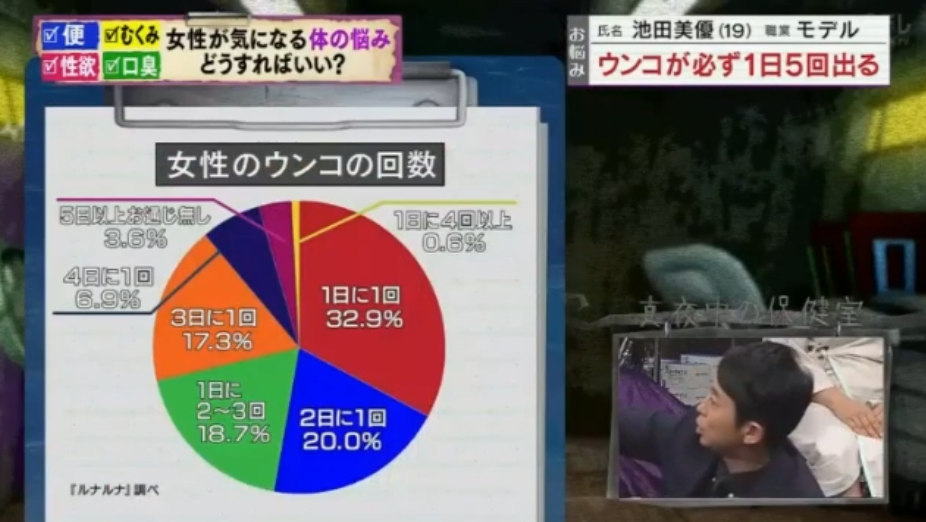 番組で紹介された『ルナルナ』の調査によると女性は便秘気味。便秘の基準となる「3日以上お通じ無し」は27.8%にものぼり、みちょぱのように「1日に4回以上」となるとわずか0.6%しかいないと判明している。