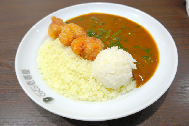 カリフラワー120グラムを盛り、白米30グラムを添えた。約400キロカロリーで、白米だけの場合の3分の2に抑えた。トッピングは「ホウレン草とフライドチキン」「ミニハンバーグとチーズ」「イカとソーセージ」の3種から選べる。税込み670円で、関東の1都3県(東京都、神奈川県、千葉県、埼玉県)と大阪府では690円。