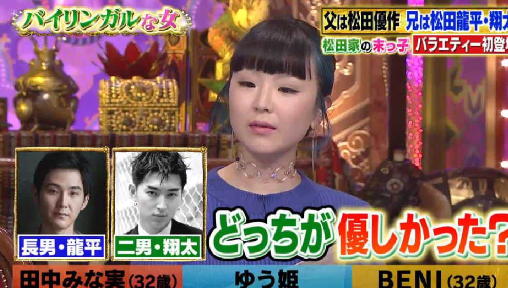 ゆう姫がスタジオに登場すると、番組MCのチュートリアル・徳井義実やフットボールアワー・後藤輝基らは「お母さん似てますよね?」「そっくり」と母で女優の松田美由紀に似ていると印象を口に。ゆう姫が「え?」と意外そうな声を上げながら、「龍平に似てるって言われます」と明かすと、「似てますね~」「確かにね」とスタジオからはそれにも納得の声が上がった。