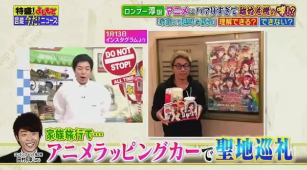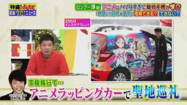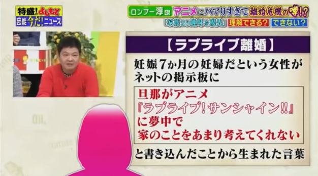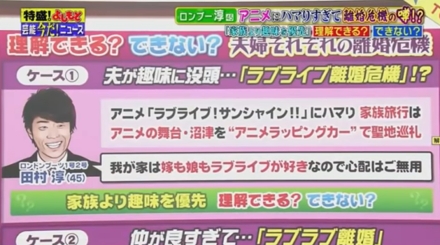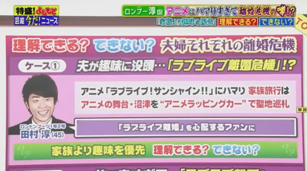 番組では、人気テレビアニメ『ラブライブ!』シリーズ(TOKYO MXなど)にハマりすぎて夫婦仲が悪くなり、結果的に離婚危機に陥るという「ラブライブ離婚」について取り上げ、淳を『ラブライブ!』にハマる大人の代表、そして、自身の趣味に家族を巻き込む「毒夫」として描いたというのだ。