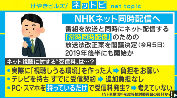 「根本的な問題は、払わなければいけないことではなくて、払わなくても見られるというケースがあること。その不公平さのために払う・払わないという議論が起きている。『漫画村』もそうだが、タダで見られるとなるとお金を払うことがバカらしくなる。地デジ化したんだから、テレビもスマホもネットもNHKはお金を払わないと画面が映らないようにして、クレジットカードを登録して料金を払うようにすればいい」