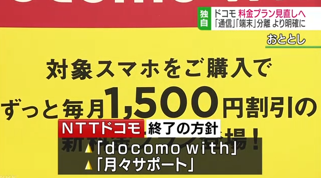 NTTドコモが終了する方針を固めたのは、特定の端末の購入を条件に通信料金を毎月1500円割り引く「docomo with」と、購入する端末に応じて最大2年間、通信料金を割り引く「月々サポート」です。