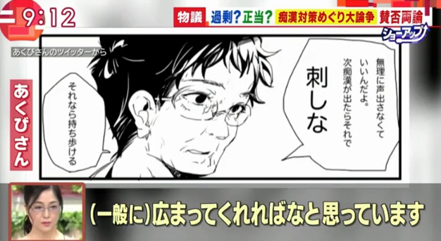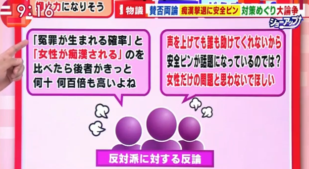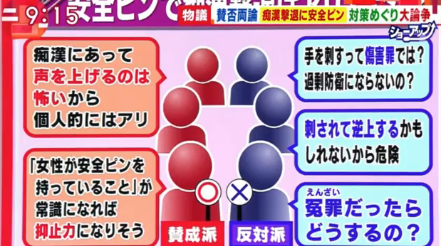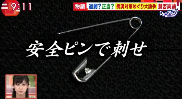 男は強制わいせつの疑いで現行犯逮捕された。番組では、こうした痴漢行為にネット上では痴漢撃退に安全ピンを使うことへの賛否両論が巻き起こっていることを紹介した。