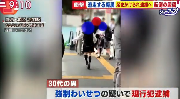 30日放送のテレビ朝日「羽鳥慎一モーニングショー」(月~金曜・前8時)で28日朝、JR赤羽駅で痴漢行為をした30代の男が女子高生に追われたところを男性に足をかけられ転倒した瞬間の映像を放送した。
