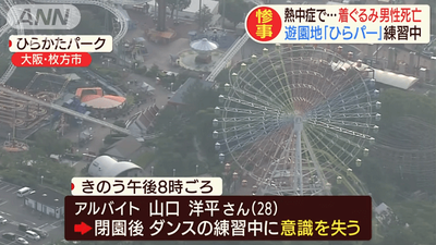 関西を代表する猛暑の街、大阪府枚方市の遊園地「ひらかたパーク」にて7月28日、スタッフ・山口陽平さん(28)が、着ぐるみショーの練習後、熱中症で死亡した。