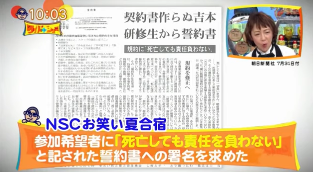 吉本興業は「免責事項の記載は手違いによるもの」と説明している。吉本興業によると、合宿は毎年、静岡県掛川市で開かれる「NSCお笑い夏合宿」。2017~19年の参加者の誓約書に、時間厳守や飲酒・喫煙の禁止に加え、合宿中の負傷や後遺症、死亡した場合にも吉本興業に対し責任を問えないなどとする免責事項が記載。さらに、トラブルへの賠償請求などもできないと書かれていた。
