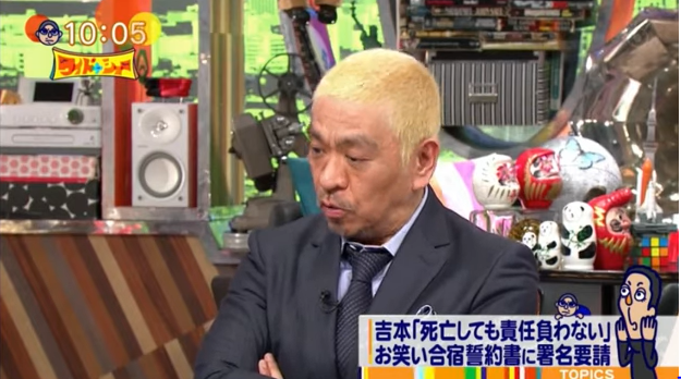 「ダウンタウン」の松本人志(55)が4日放送のフジテレビ系「ワイドナショー」(日曜・前10時)に出演。吉本興業が、同社のタレント養成所「NSC」の合宿参加希望者に対し、「合宿中に死亡しても(吉本興業は)責任は負わない」などと同社への免責事項を盛り込んだ誓約書への署名を求めていたことに「そんな過酷な夏合宿、たぶんオレが行っても面白いことは言えないでしょうね。怖いですね」とコメントした。